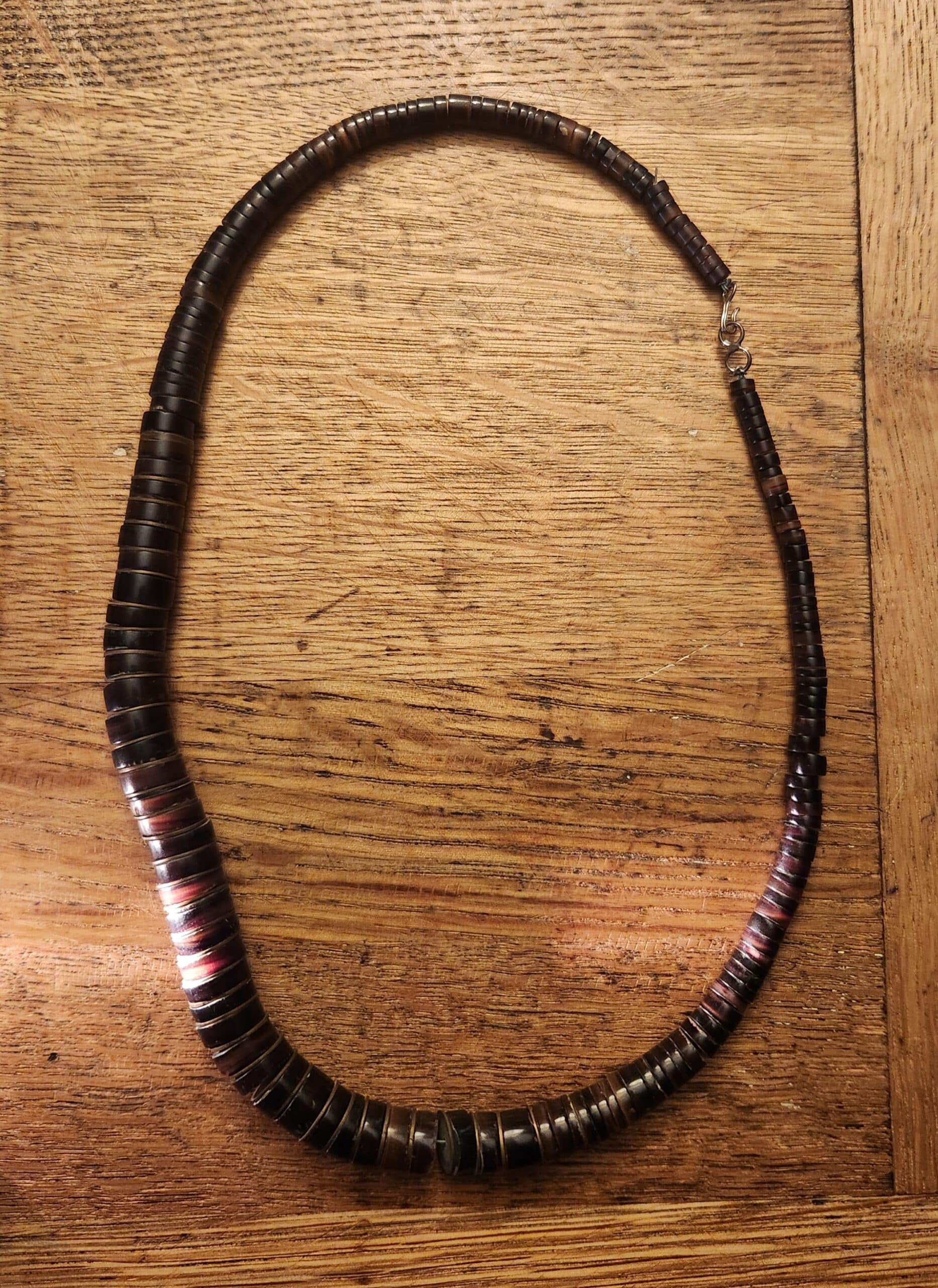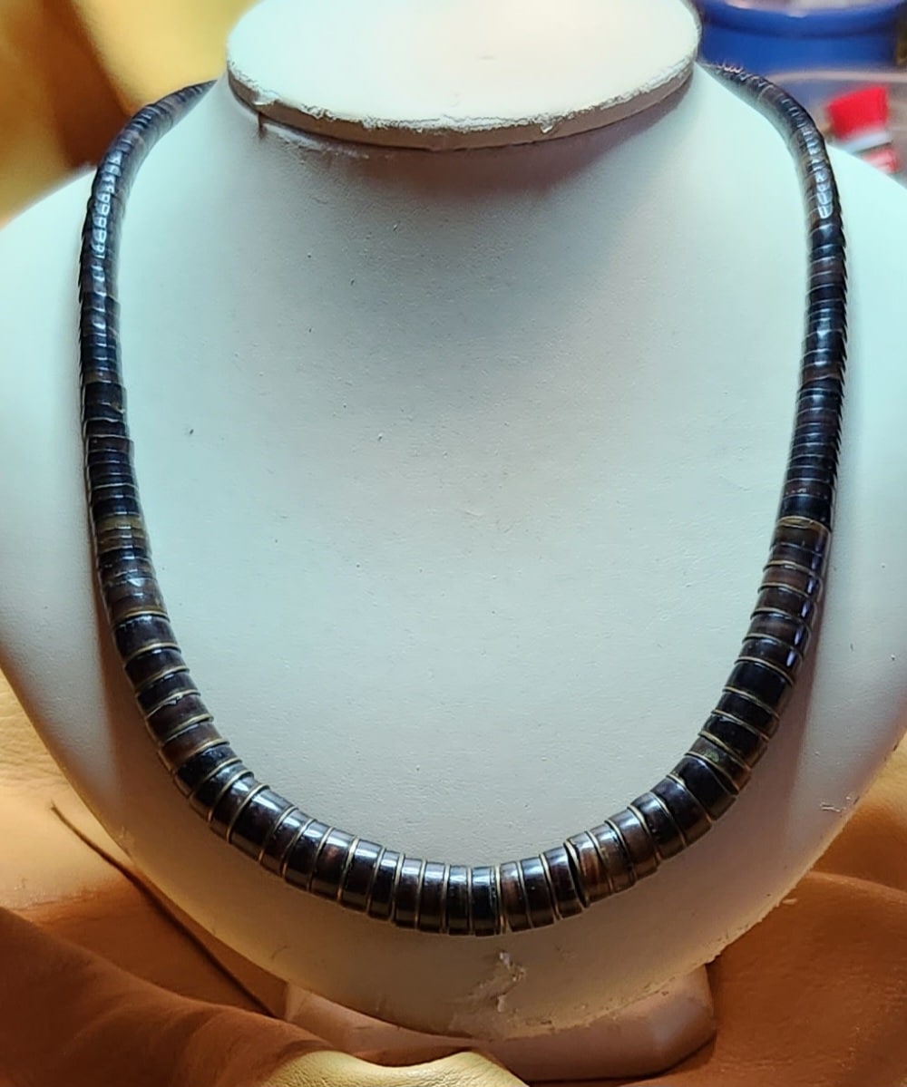 Penn shell heishi choker Santo Domingo Pueblo made Beautiful amber color with brass disc beads 19″ $90